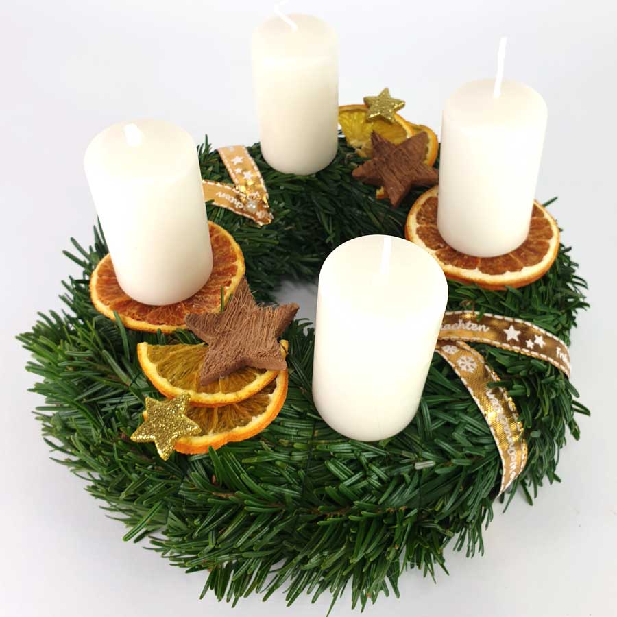 Adventkranz gewickelt aus heimischen Reisig mit Kerzen (7x4cm) in weiß mit Trockenfrüchten .