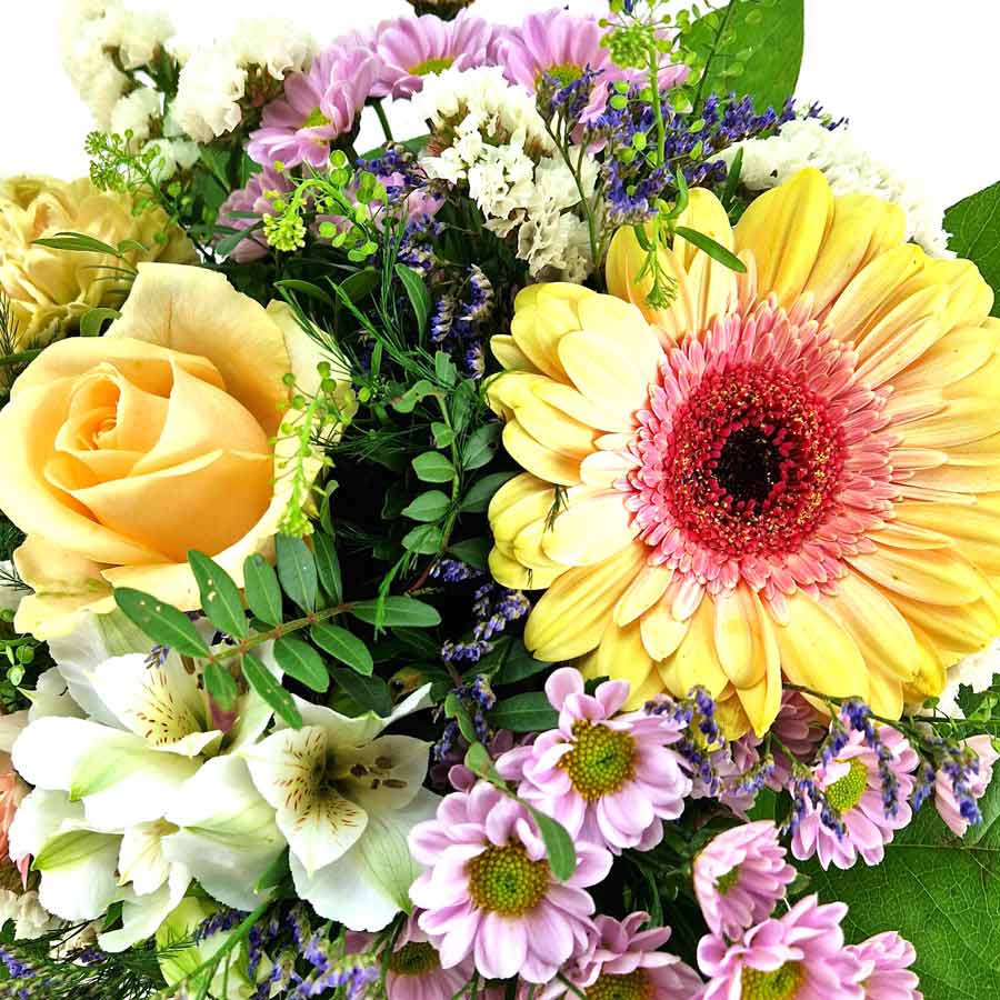 Dieser liebevoll gebundene Blumenstrauß in pastell verzaubert mit einer harmonischen Kombination aus zarten Pastelltönen und frischen Grüntönen. Im Mittelpunkt steht eine edle, cremegelbe Rose, umgeben von einer farbenfrohen Auswahl aus Gerbera, Chrysanthemen, zarten Nelken und filigranen Beiwerkblüten.