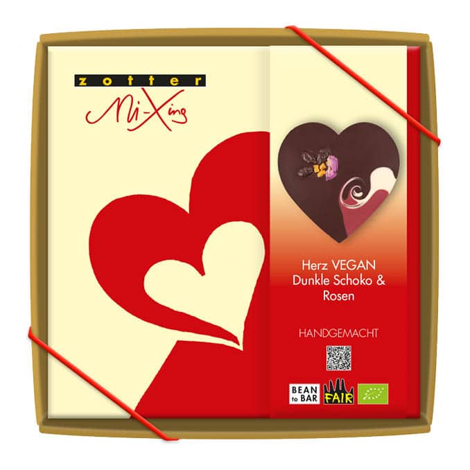 Ein veganes Schokoherz aus dunkler Schokolade mit 70 % Kakaopower, gemustert mit einer fruchtig-pinken Himbeer-Kokos-Kuvertüre und einer weißen Kuvertüre, die auf Reis basiert. Verziert mit duftenden Rosenblüten, in Zimt gerollten Apfelstückchen und gerösteten Kürbiskernen umhüllt von dunkler Schokolade. Die schöne pinke Farbe entsteht ganz natürlich nur aus Himbeeren. Verpackt in einer dekorativen Geschenkbox.